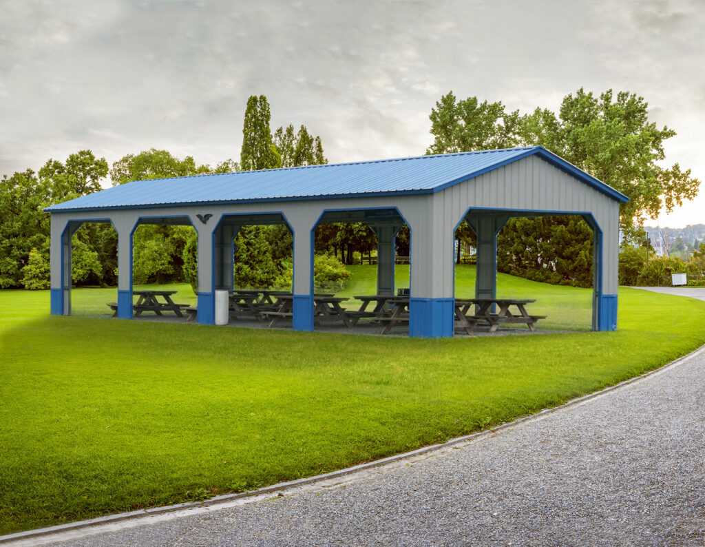 This 20x50x9 Picnic Shelter is built with a Royal Blue Vertical Style Roof, Pewter Gray Vertical Sides and Ends with Royal Blue Trim and Wainscoting, 9-ft Side Leg Height, (2) 16’x8′ End Dutch Framouts, (8) 10’x8′ Side Dutch Frameouts, Ground Package with Mobile Home Earth Augers, and is Engineer Certified for 140MPH / 35PSF.